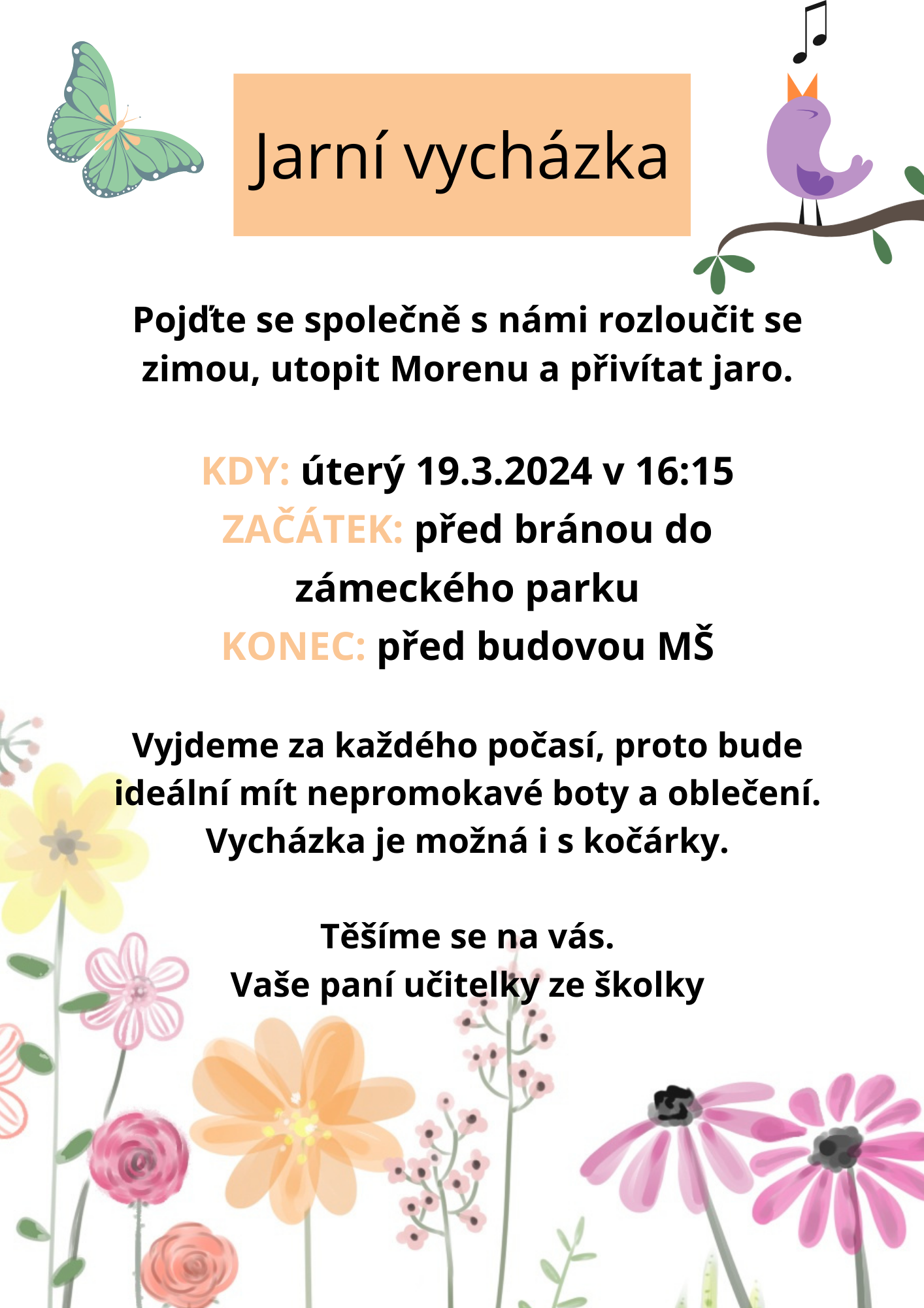 Srdečně vás zveme na společnou JARNÍ VYCHÁZKU. Budeme se loučit se zimou, utopíme Morenu a přivítáme jaro a to 19.3.2024 v 16:15. Bližší informace na pozvánce v příloze.