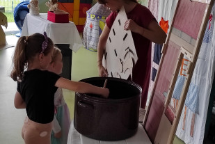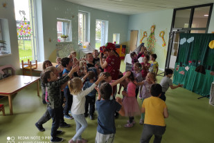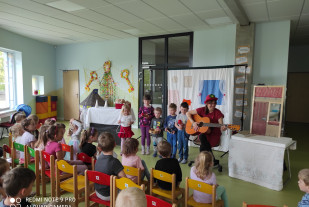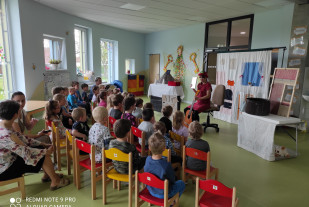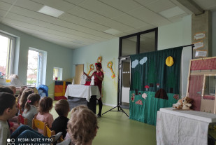 V pondělí 6.5.2024 za námi do školky přijela paní Šárka Svobodová se svým divadýlkem. Pro děti si připravila pohádku Jak pejsek a kočička vařili dort a O pyšné noční košilce. Děti zažily spoustu zábavy. Pomáhaly pejskovi a kočičce přidávat do hrnce ingredience, zpívaly písničky a na konci si užily bublinkouvou zábavu.