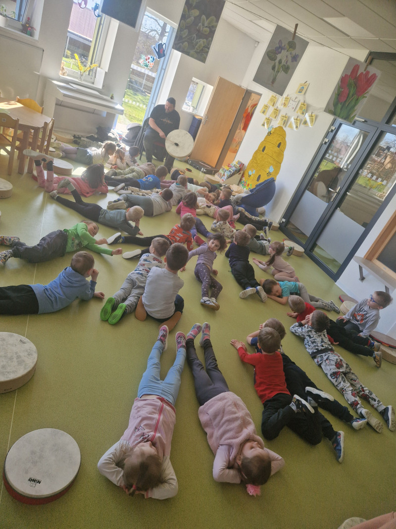 Dne 8.4. 2026 přijel do naší školky pan Lukáš Vídenský s hudebně výchovným programem ,,Bubnování". Děti se během programu zábavnou formou seznámily s africkou písní s pohybem, měly možnost zabubnovat si známé lidové písně, své jména a pohybově se vyjádřit.