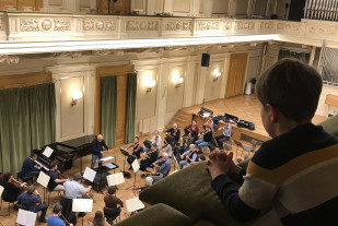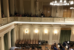 Ráno jsme měli velkou rezervu, takže i přes dopravní zácpu jsme stihli pizzu na České, čímž jsme zahájili naše putování. Potom už jsme směřovali do Besedního domu, kde jsme snědli první část svačin a šli do zkušebny pěveckého sboru, kde nám harfu představila paní harfistka. Zahrála nám několik skladeb včetně Vyšehradu, tedy znělky stanice Vltava. Zkoušeli jsme si na gumičky, jaké to je, když se musí prstem drnknout. Nakonec jsme se mohli jít podívat z galerie na zkoušku filharmonie, to byl další výborný zážitek.