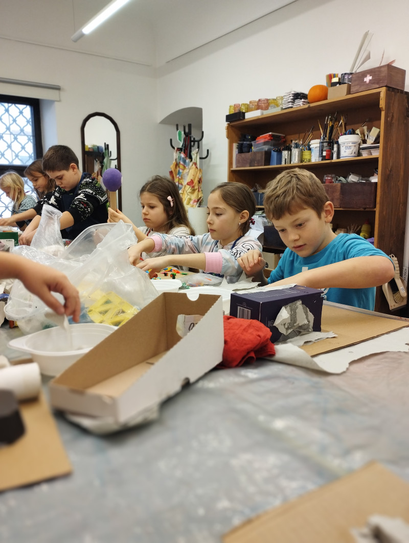 Vyzkoušely si také výtvarnou techniku asambláže, se kterou Petr Vlach pracuje, a samy tvořily vlastní originální díla. Program byl velmi pestrý, děti si užily nejen pozorování uměleckých děl, ale i vlastní kreativní tvorbu. Návštěva galerie byla pro všechny inspirativním a příjemným zážitkem. Jako čtenáři jsme opět museli zajít i do zdejší knihovny. Kde se nám moc líbí.